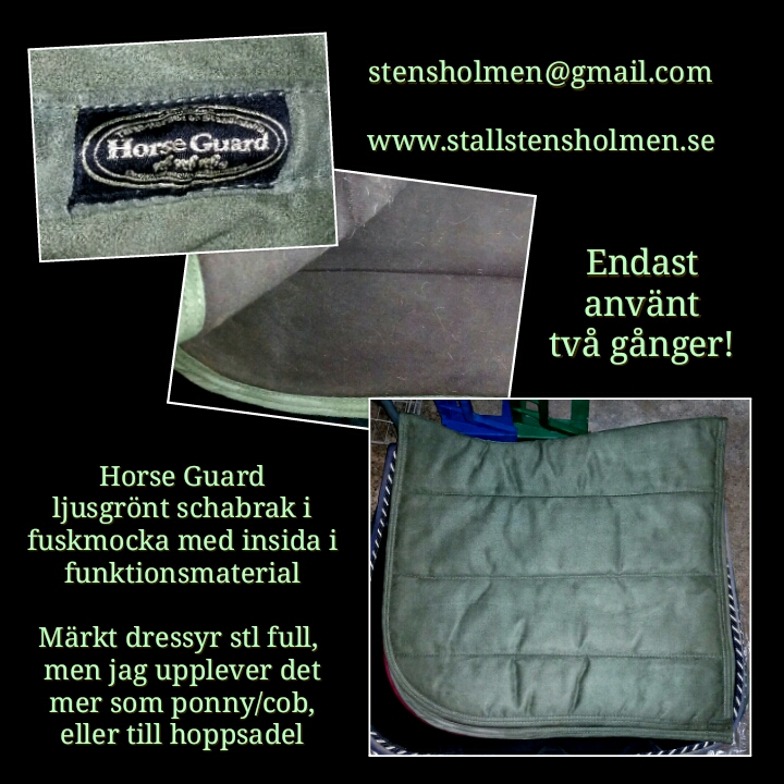 Ljusgrönt Horse Guard schabrak i fuskmocka med insida i funktionsmaterial. Märkt dressyr storlek full, men jag upplever det mer som ponny/cob, eller till hoppsadel. Mycket bra skick – endast använt två gånger.