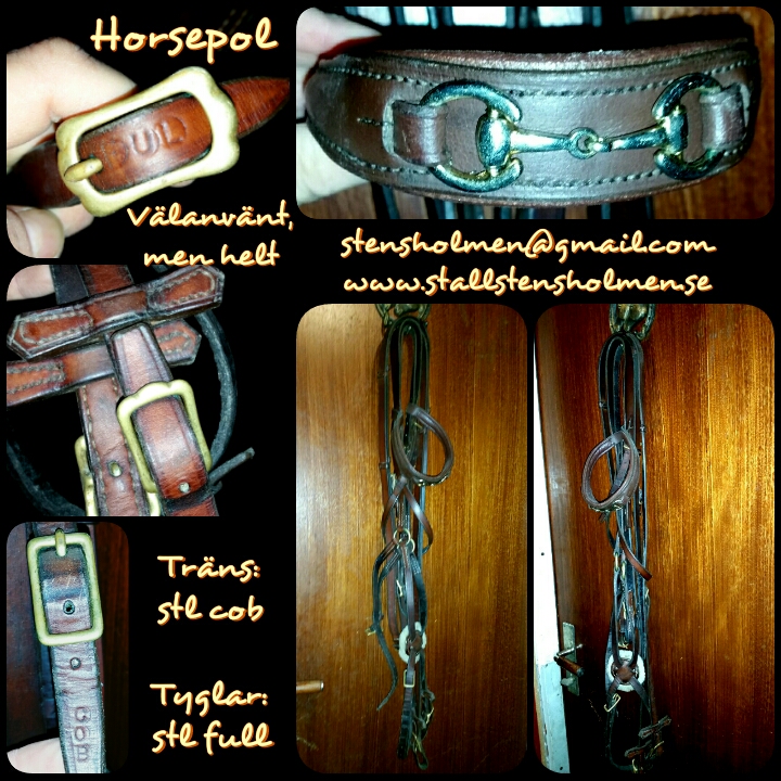 Horsepol träns komplett med Horsepol tyglar – som dock är av nyare modell än tränset, så de har inte identiska mässingspännen. Tränset är storlek Cob, tyglarna är storlek Full.