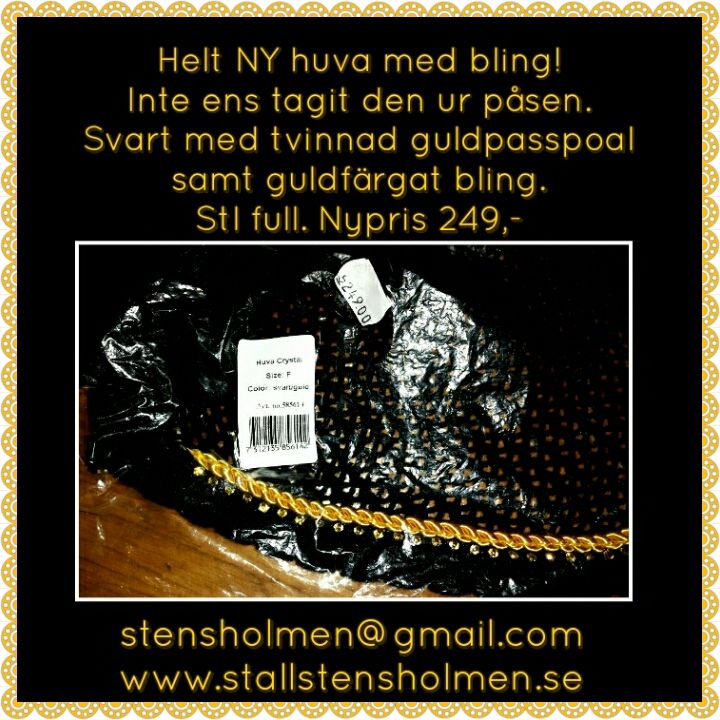 Helt NY huva med bling! Inte ens tagit den ur påsen. Svart med tvinnad guldpasspoal samt guldfärgat bling. Storlek full. Nypris: 249,-