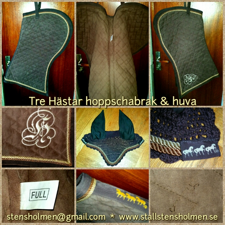 Set med hoppschabrak och huva av märket Tre Hästar. Brunt med dubbla rep-passpoaler i färgerna latte/kola och ljus guld. Storlek full. Stort broderat emblem på vänstersidan. Två små sömmar på quiltningen har börjat lossna (se bild), men allt annat i mycket bra skick!