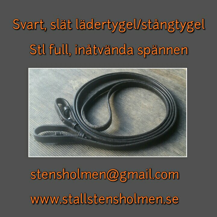 NYTT TILL SALU: Svart stångtygel 21 juni 2017 Svart, slät lädertygel/stångtygel. Storlek full, inåtvända spännen. Pris: 100,- (ev. fraktkostnad tillkommer) Maila: stensholmen@gmail.com