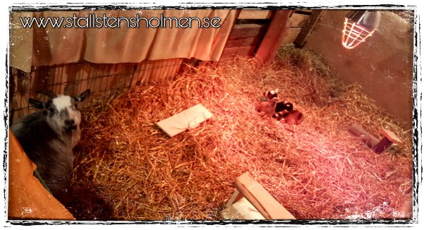 Denna bild visar klart och tydligt vad Estelle gillar värmelampan… Eller, ska jag säga INTE gillar den! Hon har en sådan tjock vinterpäls att det uppenbarligen blir lite väl varmt ibland med värmelampan. Men, hennes bebisar gillar den i alla fall!