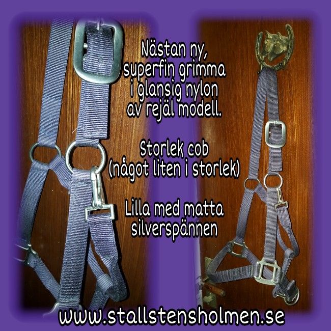 Nästan NY, superfin grimma i glansig nylon av rejäl modell. Storlek cob (något liten i storlek). Lila med matta silverspännen.