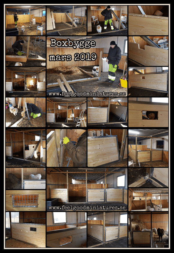 Här kommer ett ”litet” collage över vårt bygge av fölnings-/sjukboxar. Boxarna har ett innermått på cirka 2,5×3 meter, det vill säga 7,5 m2 per box. Vi är inte riktigt färdiga med allt, men jag är riktigt nöjd så här långt! Ena boxen är helt klar och i den står Mony på nätterna.
