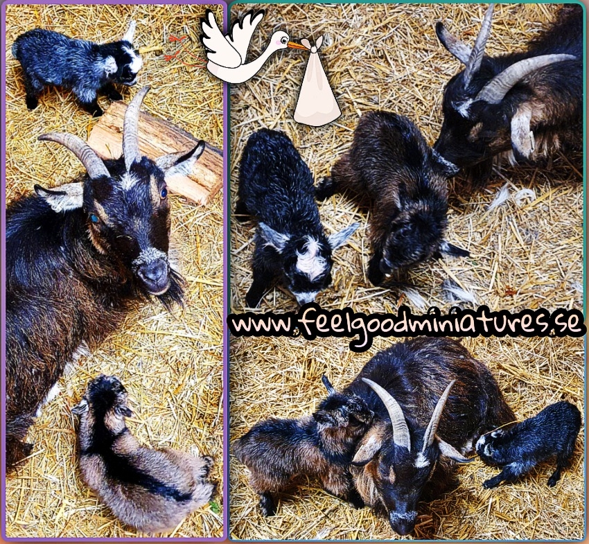 Mini fick tvillingar! En mörkgrå bockkilling och en brun bockkilling. Den mörkgrå är mycket mindre än den bruna, så den kan ha ärvt Minis lilla storlek. Hon hade svårt att krysta fram den första, så jag hjälpte till. Mini är en duktig mamma.