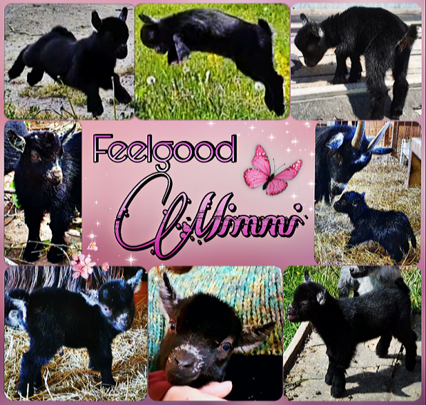 Feelgood Mimmi är den förstfödda av Feelgood Emmies trillingar. En liten, svart getkilling med lite vita hår på öron, svans och runt nospartiet. Mimmi älskar att leka och kela! Hon är en riktig raring!