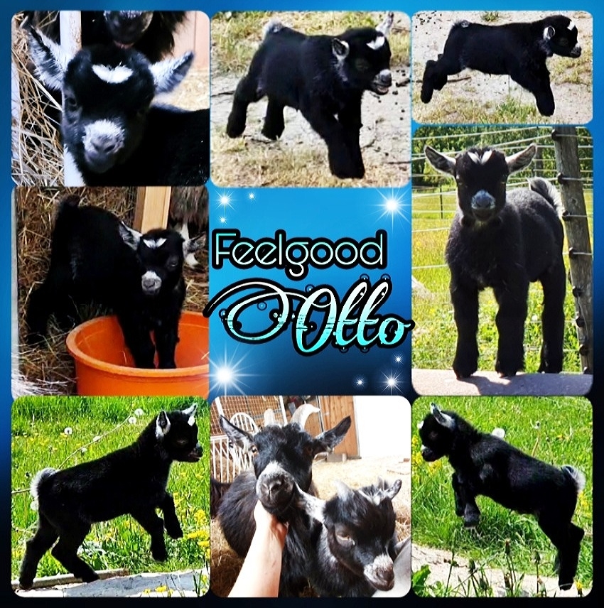 Feelgood Otto är en cool och mycket kelig bockkilling. Han är den tredje av Emmies trillingar och ser precis ut som hon, med sin svarta färg, vita stjärn, vitt på öron, svans, runt nospartiet och lite vita hår här och var över hela kroppen. Jag tror inte att han kommer att bli särskilt stor.
