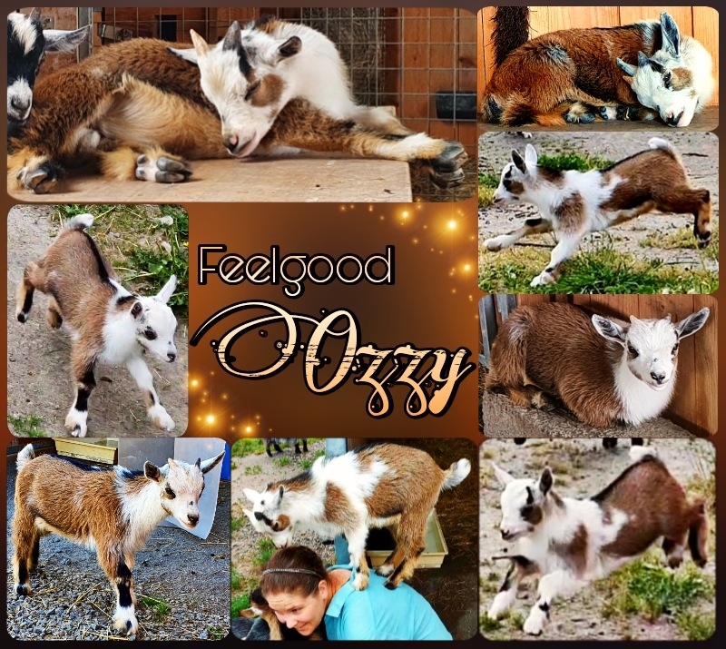 Feelgood Ozzy är en bockkilling som är lite av en busunge, men också väldigt rar, kelig och kärleksfull. Han är den förstfödda av Feelgood Zallys tvillingar. Jag älskar hans färg: en blandning av kanelbrun, créme, vit och svart. Han ett vitt horn och ett som är svart på framsidan och vitt på baksidan. Ozzy kommer att bli en stor pojke.