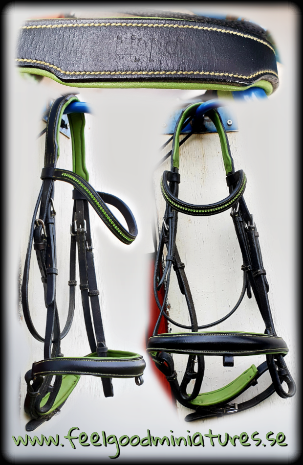 Snyggt, svart Lippo-träns i bra kvalitet med grön, mjuk fodring och u-format bling-pannband samt snygga silverspännen. Storlek full. Nosremmen saknas tyvärr.