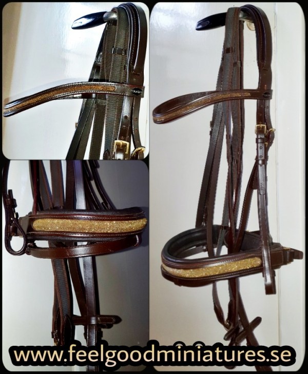 Helt NYTT, snyggt Charlies träns med svängt pannband och mjukt fodrad aachen-nosgrimma. Brunt med guldglitter. Gummivävtyglar. Fodrat nackstycke. Storlek full.